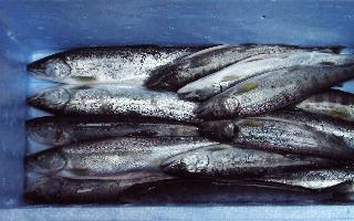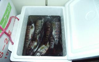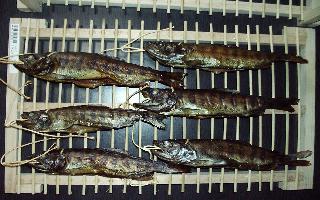 | <材料> @アマゴ20匹ばかし (1匹150gぐらいかな?) Aブライン液(ソミュール液ともいう) ・水2l ・三温糖100g〜200g ・荒塩(粗塩)240g〜300g ・白ワイン100cc ・ローリエ、タイム、コショウなど少々 B たこ糸 C つま楊子 D たこ糸、フック、洗濯物干し (できたアマゴをつるす) E 発泡スチロールのトロ箱 40cm角ぐらい |