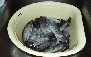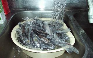 | <わたくしの作り方> ☆作り方は色々あるけど・・・とりあえず 1) まずはブライン液から・・ソミュール液とも言うらしい。 水2リットルを沸かして、荒塩を入れ、三温糖を入れかき混ぜる。 この時ローリエを2〜3枚ちぎって入れ、タイム少々コショウ少々、たまにタマネギのちっちゃいのを入れたりする。 よく溶かしたら後は冷やす。 2) 今までに釣ったアマゴを解凍! これは、ビニール袋に入れて流水をかけておくとわりあい早く解凍 できる。 ネコに注意(家ではよく、ようすをうかがいにやってくるので・・・) ☆アマゴを洗う 1) 荒塩をこすりつけてゴシゴシ!少々ぬるぬるしてるけどまあいいか。 皮まで食べるならスポンジで尾ビレから頭にかけて逆洗いすると、ギンギラの鱗(うろこ)がよくとれる。 2) よーく中まで洗ったら、後は冷たくしたブライン液に漬けておくのだ。 (釣りたてだとここまでしなくてもいいんだけど、なんせ釣ってすぐはなかなか出来ないので・・・・) 3) 冷蔵庫に入れて冷やせればいいけど、なかなか冷蔵庫の中はいろいろな食品でいっぱい!。 そこで、発泡スチロールのトロ箱に入れて、氷のかたまりなどをビニールで包んで一緒に入れておくと簡易冷蔵庫の出来上がり。 出来れば7〜8時間の間は夜の方が温度が上がらずにいい。 続きは2日目に突入! |