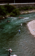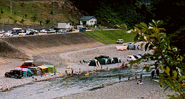 有田川 川口上流での鮎釣り 清水町遠井のキャンプ場 有田川の清流と涼風は時のたつのを忘れさせてくれる 二川ダムに行くと 中程に吊り橋がある 納涼にはもってこいのところだ