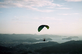 この写真は吉備町 コスモス スカイクラブの 岩倉重信氏のご協力に よるものです フライトは春から秋にかけて 最も多く フライトエリア 海抜589mを飛び立ち 気流の良い日は1500m まであがります